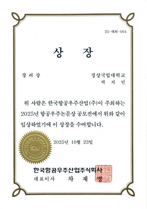 우리 학과 석사과정에 재학 중인 박지민 학생(지도교수 이왕상)의 논문이 2025 항공우주논문상 공모전에서 장려상을 수상 하였습니다.